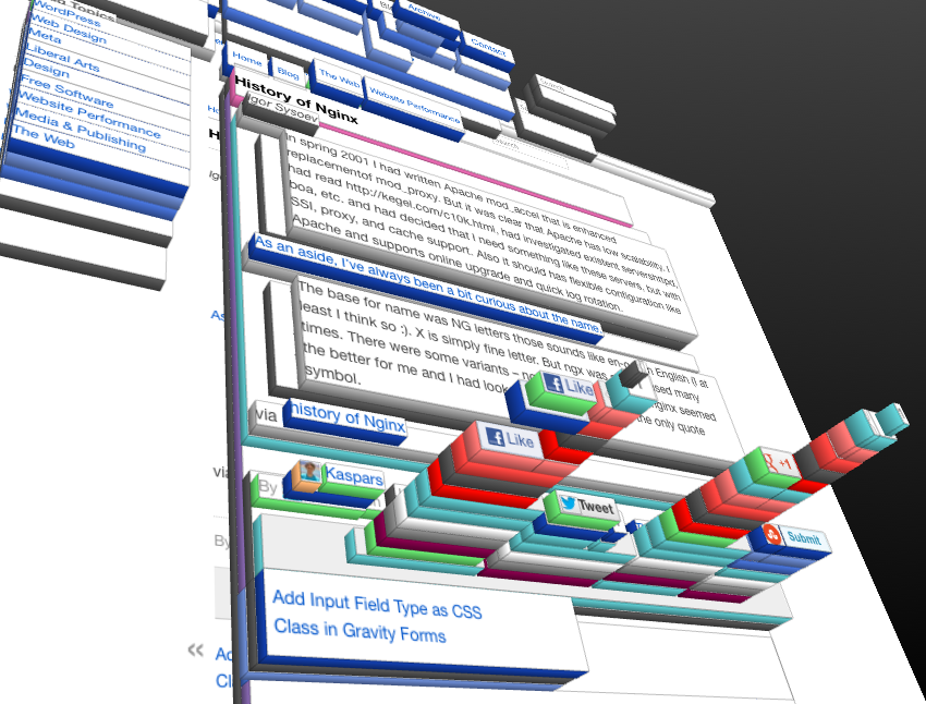 The new 3D DOM inspector in Firefox is simply amazing. Just look at those skyscrapers of the social share buttons — Twitter and StumbleUpon seem to be the thinest.