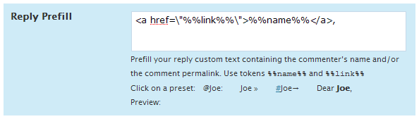The default reply prefill looks like this: @%%name%%:... , but I wanted to include also a link to the original comment: <a href="%%link%%">%%name%%</a>, ...