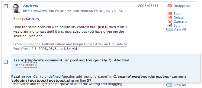 Today I installed the very useful Ozh’ Absolute Comments plugin that makes the process of replying to comments a lot easier. However, when trying out the inline (and ajaxy) comment reply feature within the ‘Manage Comments’ section of WordPress admin for the first time, I got the following error message: