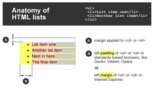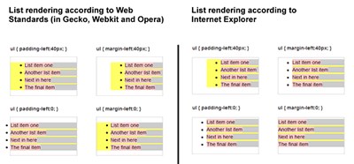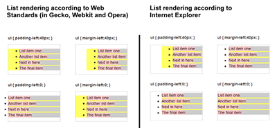 Let’s look at the default rendering of ordered <ol> and unordered <ul> lists by Web standards aware browsers (with Gecko, Webkit or Opera rendering engine) and Internet Explorer (IE).