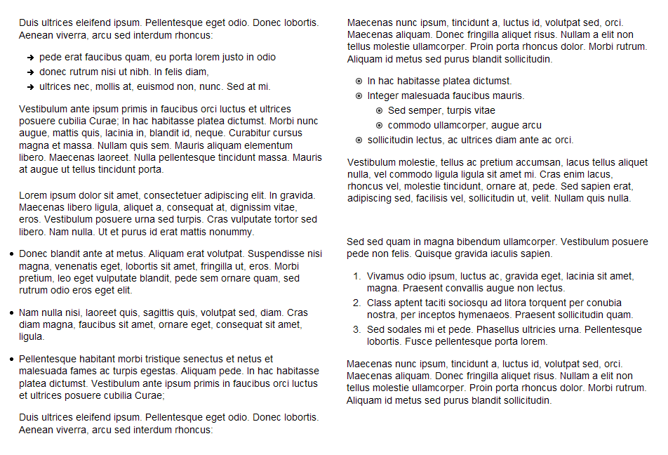 Notice that the spacing between list items in the last example (rounded image bullets) is larger than the default one (arrow image bullets). This enhances readability and separates list items similarly to paragraphs. So here is the final set of CSS styles to suite most of the needs:
