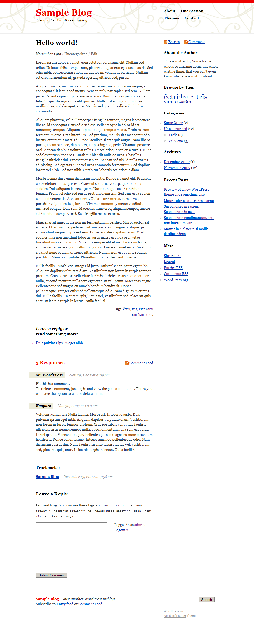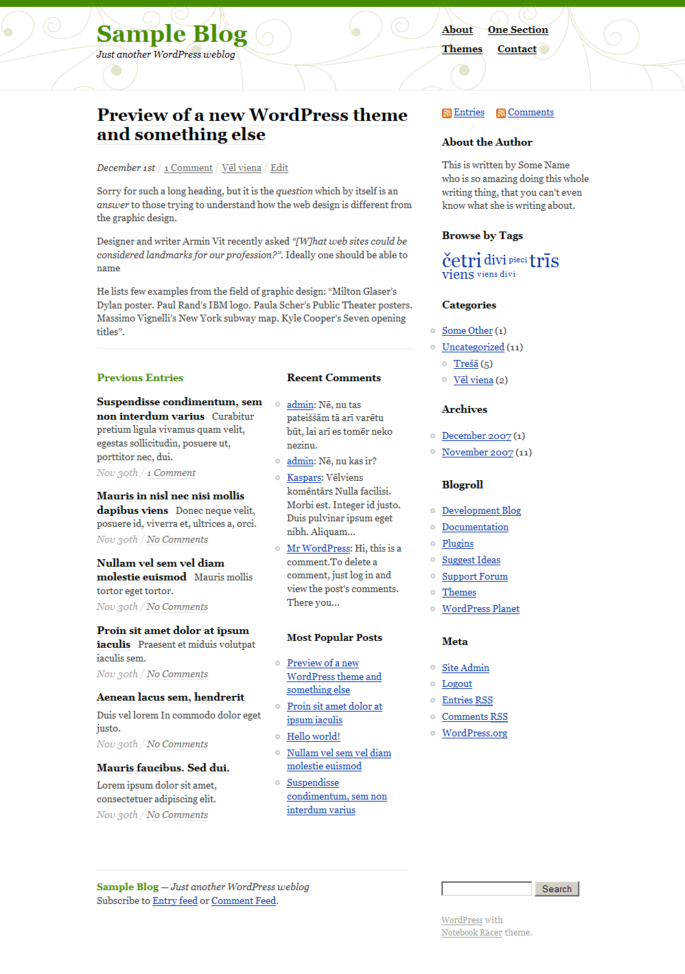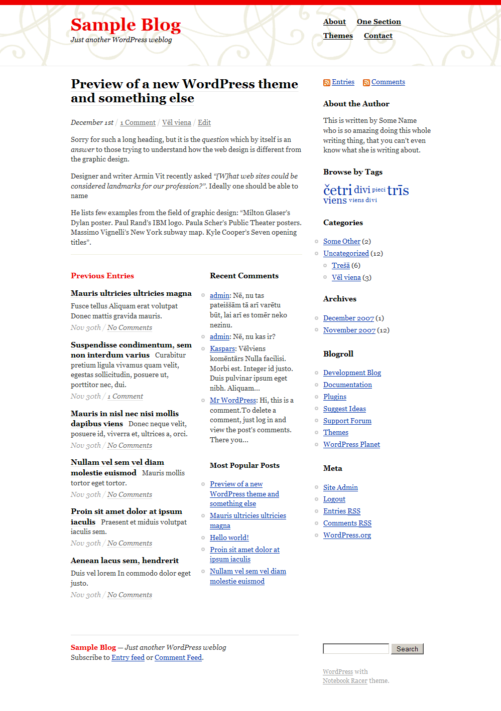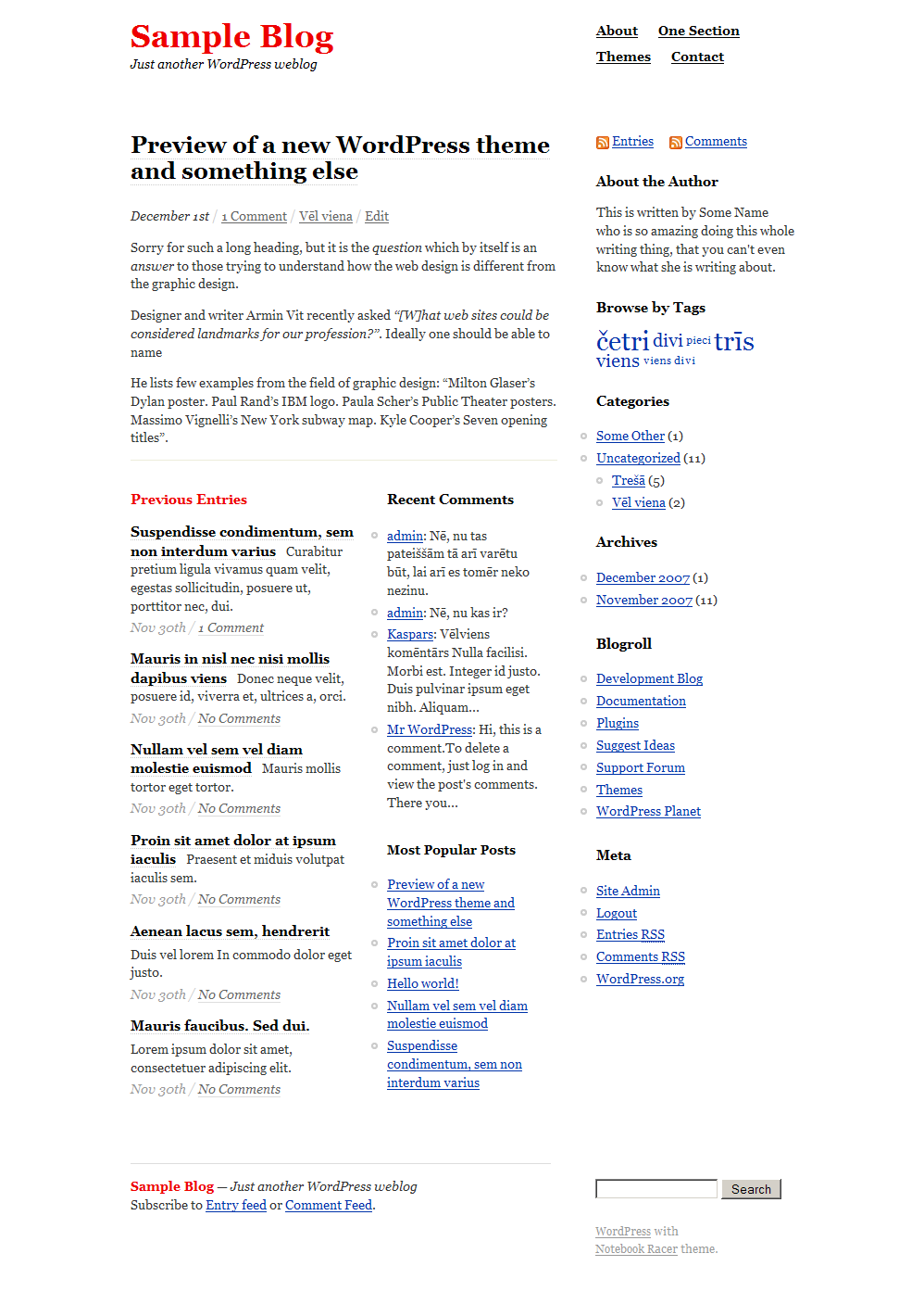 Here are a few screen captures of the theme I am currently working on. Notice the home page layout for the older posts, and how easy it is to adjust the header and the main color.