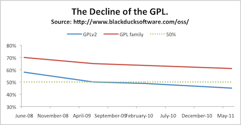 It is worth noting that the number of projects using the GPL licenses has increased in real terms over the past few years. According to our calculations based on Black Duck’s figures, the number of GPLv2 projects rose 5.5% between June 2009 and June 2011, while the total number of open source projects grew over 16%.