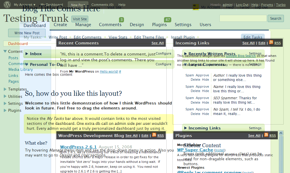 Great, clean, intuitive interface. I currently use Ozh Admin Drop Down Menu to tame menus. I hardly utilize the dashboard at all, as there is too much to scroll through. I appreciate your approach by use of interactive tabs to customize the user experience.