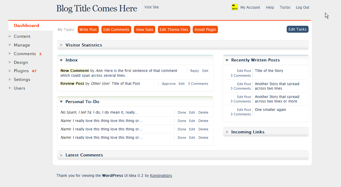 Here is another take on how to improve WordPress Dashboard. See also the Widget Administration section.