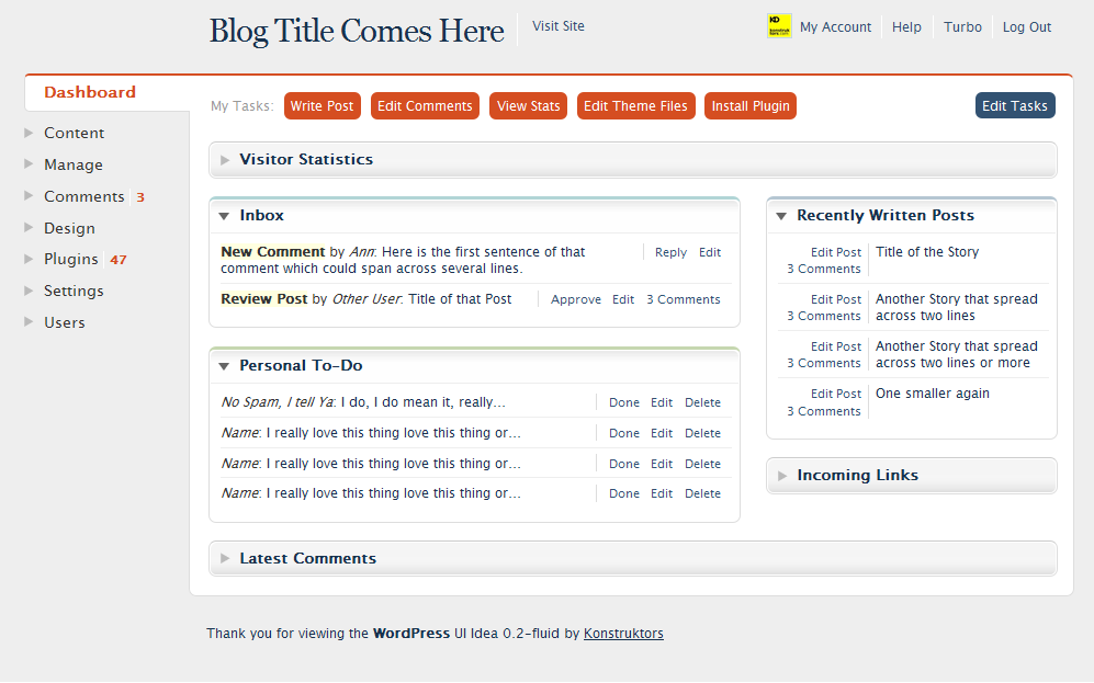 WordPress Dashboard UI Idea #3 September 22, 2008 Development, WordPress Fluid width WordPress administration user interface: idea (no.3). WordPress Admin User Interface Idea No.3 Open Share Icon that Looks Good at Small SizesTabbed Widgets Plugin Update (0.76)