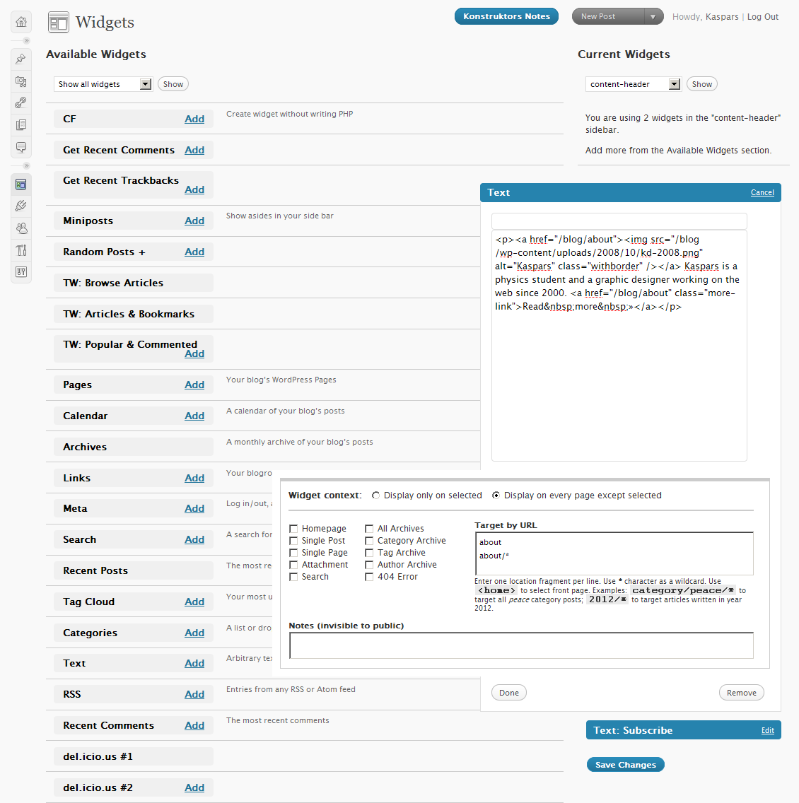I am finally publishing my Widget Context plugin as an α release at the official plugin repository. If you find a bug, or if you know how to fix that bug where the context settings are not saved for widgets that are added fresh to the sidebar on the first ‘Save’, then please leave a comment.